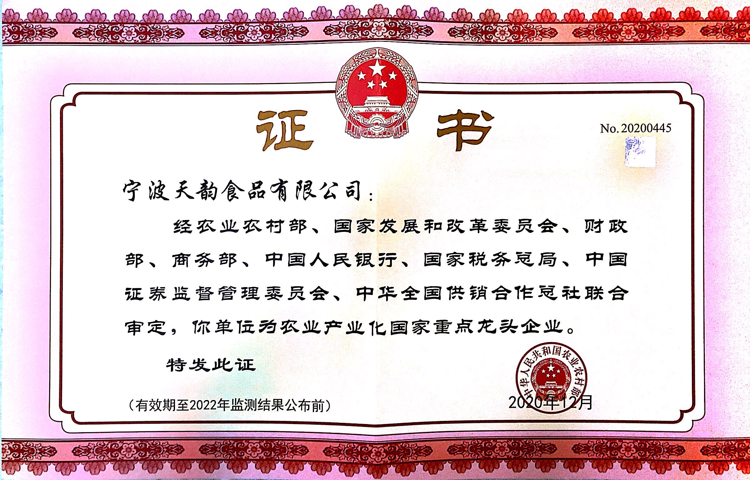 近期,經(jīng)農(nóng)業(yè)農(nóng)村部、國家發(fā)展和改革委員會、財政部、商務(wù)部、中國人民銀行、國家稅務(wù)總局、中國證券監(jiān)督管理委員會、中華全國供銷合作總社聯(lián)合審定,公司與寧波天韻食品有限公司雙雙順利通過第九次農(nóng)業(yè)產(chǎn)業(yè)化國家重點龍頭企業(yè)監(jiān)測復(fù)評。